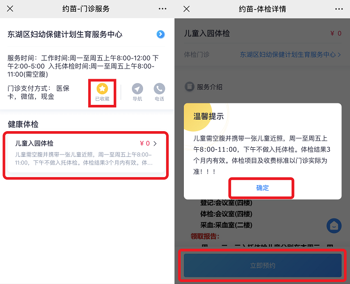 4、点击【儿童入园体检】,浏览温馨提示,点击确定,【立即预约】;