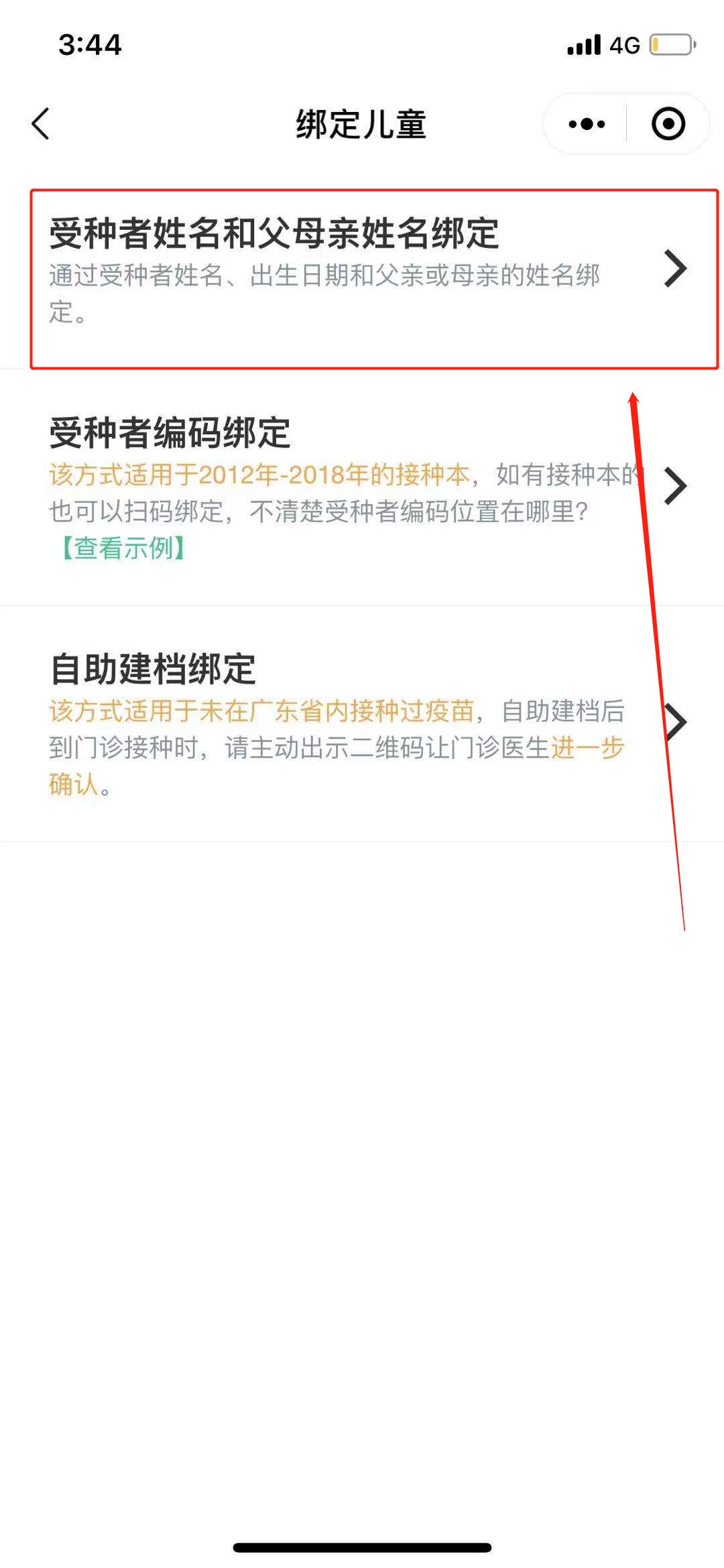 第四步:选择一种绑定方式(部分有条件限制),如果不符合下方橙色字体的直接选择第一种【受种者姓名和父母姓名绑定】即可。