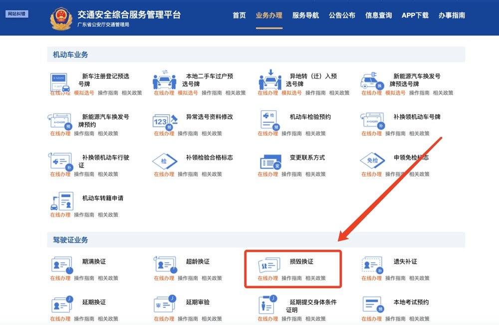 用户在互联网登录后,点击【驾驶证业务】→【损毁换证】业务功能办理。