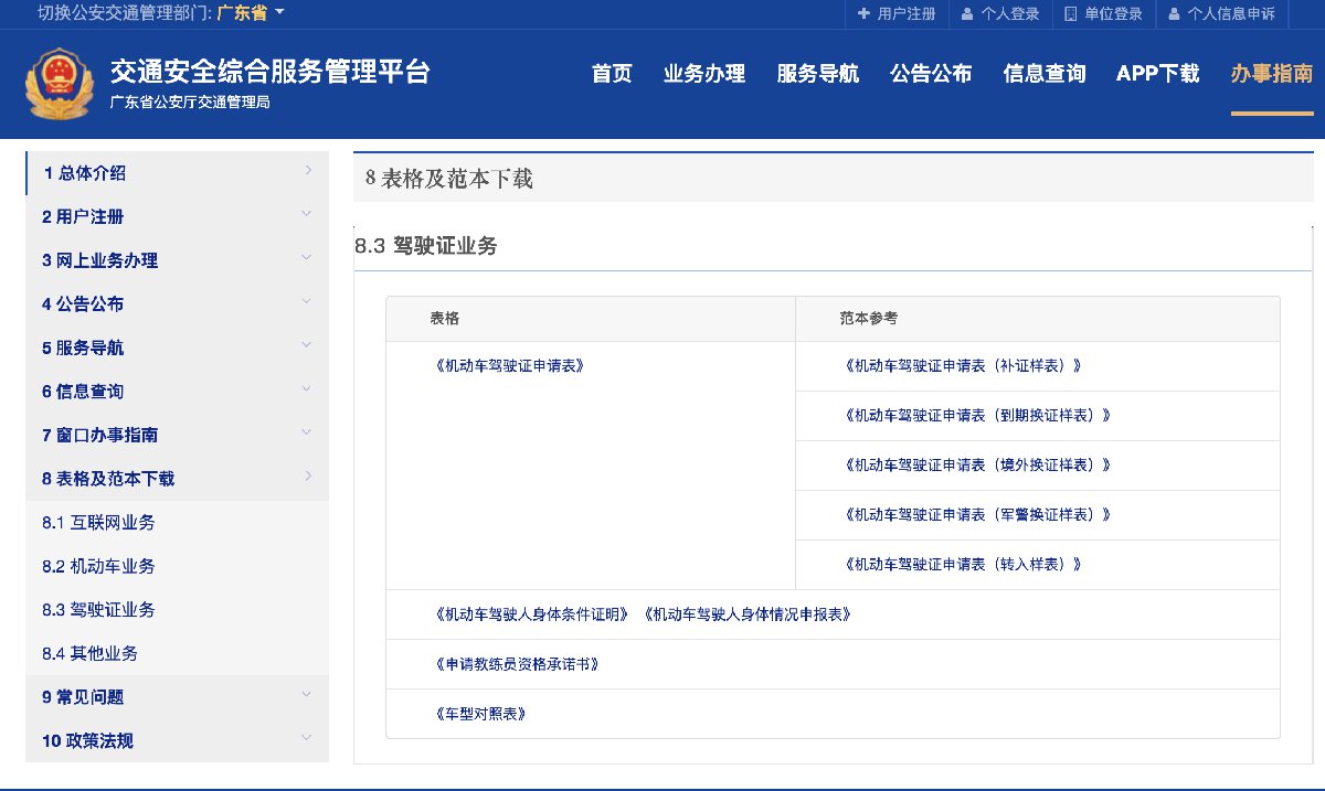 2.登录【交通安全综合服务管理平台】,点击【办事指南】-【表格及范本下载】-【驾驶证业务】,下载表格。或自行前往车管所办公窗口领取。