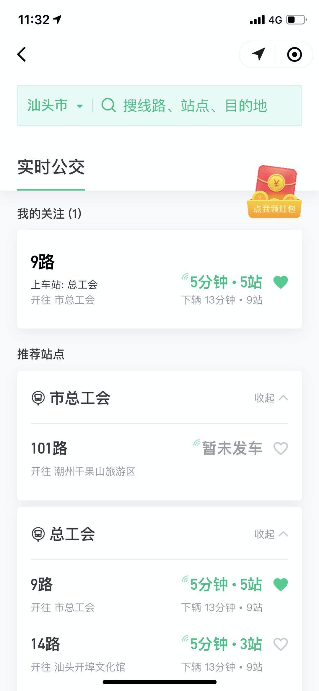 查看实时公交信息,并关注一条实时公交线路,即可获得一个2元乘车红包。(点击线路后面的小爱心~)