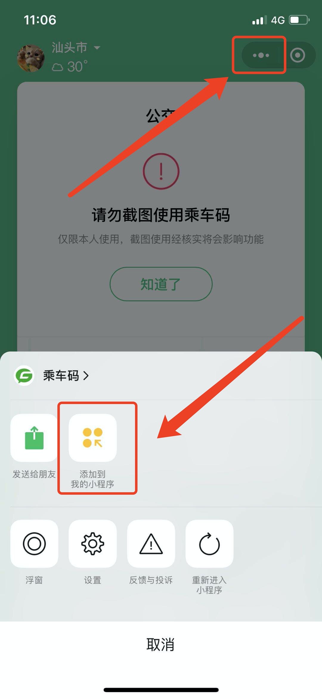 方法二:打开乘车码点击右上角的三个“···”点图标,再点击添加到我的小程序即可。