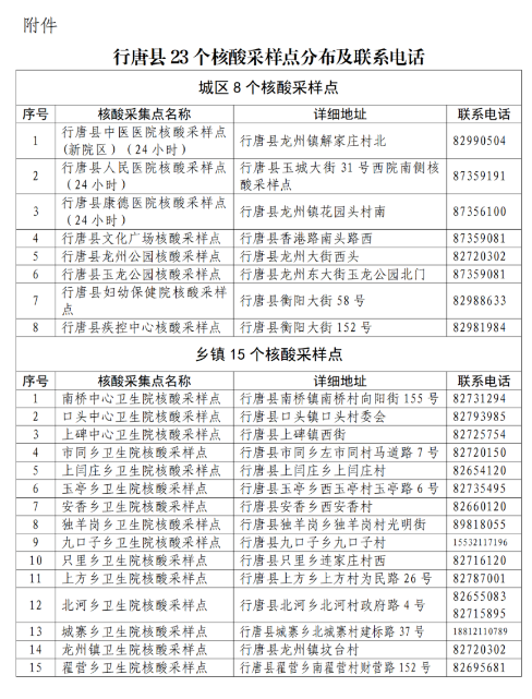 二、采样地点为方便居民就近进行核酸采样,在县城区域和各乡镇设置了23个采样点(见附件)和流动采样点,居民可结合本人实际,选择合适时间,前往采样点采样;流动采样点根据属地村委会、社区居委会通知,居民可选择合适时间前往。