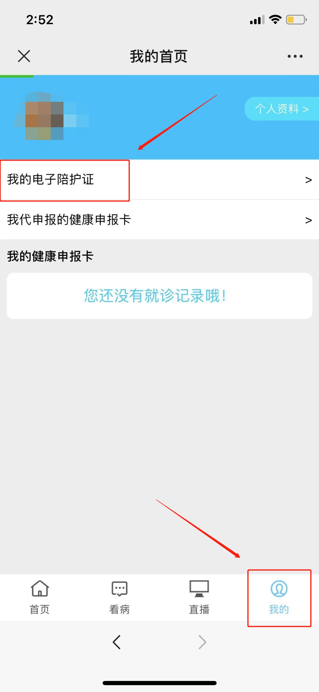 第一步:点击下方菜单栏【我的】然后再点击【我的电子陪护证】即可重新申领。