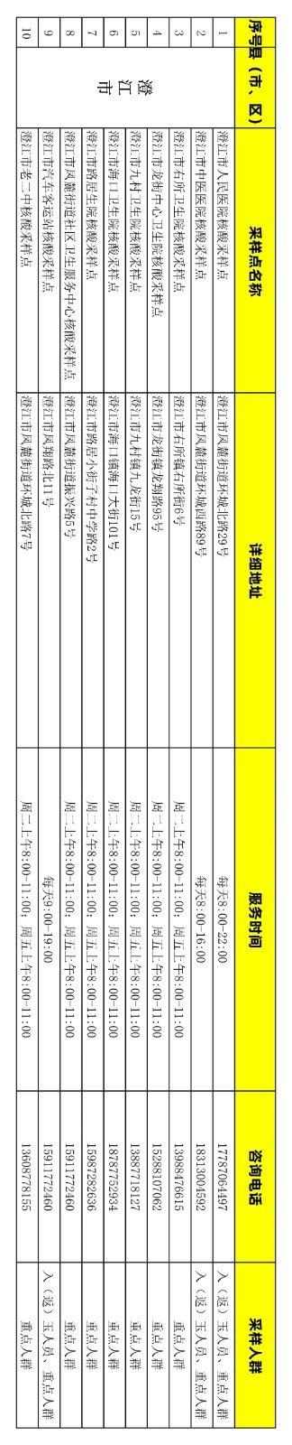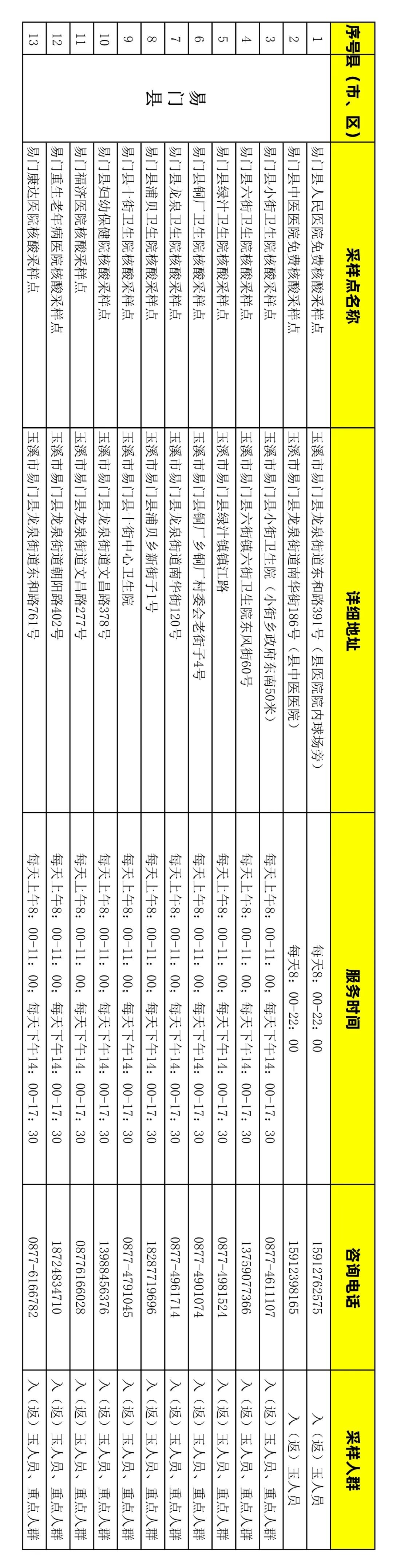 为进一步加强源头管控,切实强化监测预警多点触发机制,做好重点人群和入(返)玉人员的免费核酸检测工作,做到“应检尽检”。玉溪市各县(市、区)共102个免费核酸检测点,具体分布为:红塔区14个,江川区11个,澄江市10个,通海县11个,华宁县6个,易门县13个,峨山县9个,新平县14个,元江县14个。现将玉溪市新冠病毒免费核酸采样点信息进行公示,各县(市、区)采样点有调整的要及时上报调整情况。