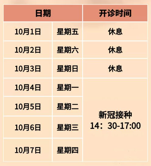 3、10月1日-3日暂停新冠接种门诊,10月4日-7日新冠接种工作继续,接种时间为下午13:30-16:00。