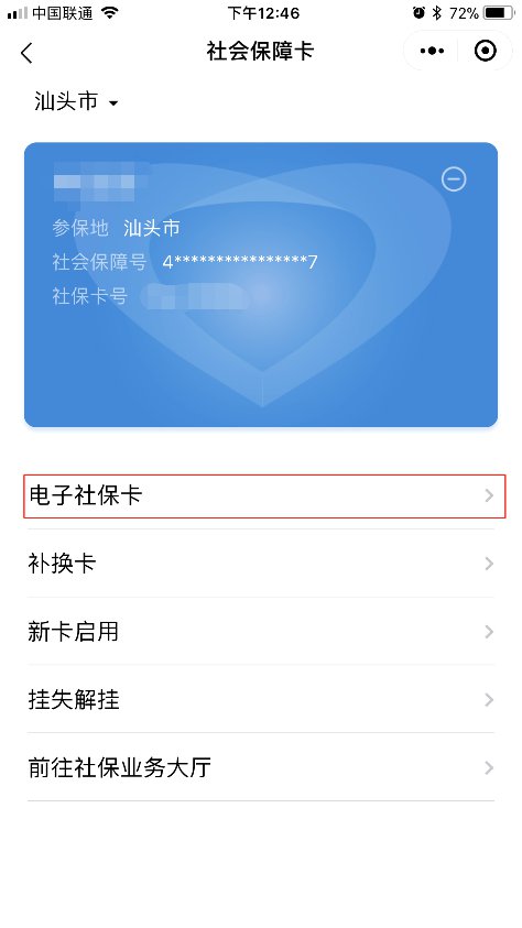 第三步:关联好汕头社保卡后,进入下一个页面后点击“电子社保卡”选项。
