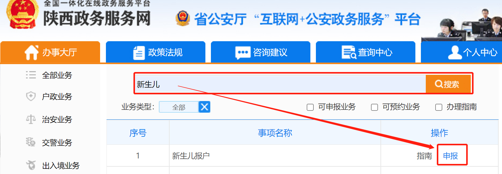 第二步:点击后会跳转到陕西政务服务网,在搜索框输入“新生儿”,点击申报;