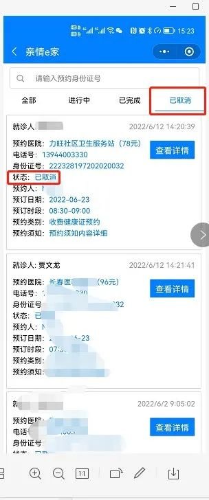 在“进行中”点击“取消预约”按钮,在“已取消”中查看是否取消