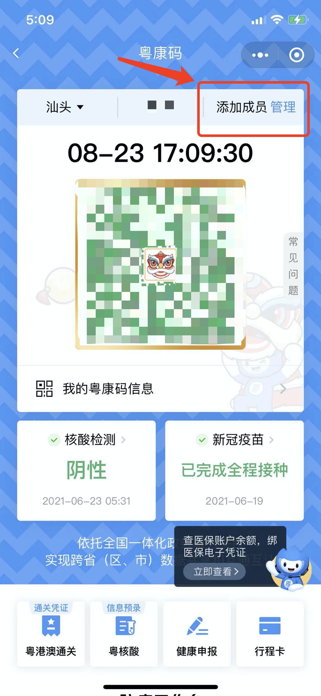 粤康码家庭成员管理功能,可添加家庭成员,代家人出示二维码。例如没有手机的老人小孩出行时,可由家人代为亮码。