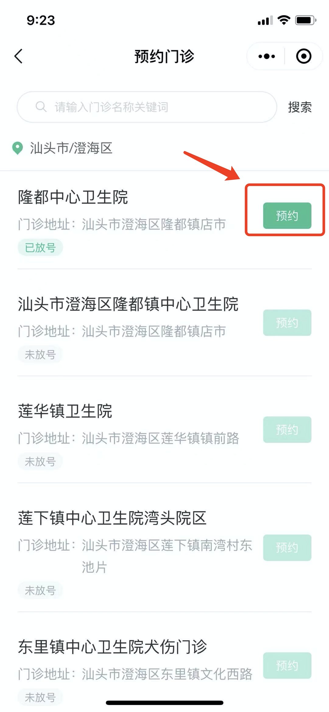 ⑤选好人群分类和接种所在地后可以查看当前有苗提供的放号的门诊,点击预约时段。