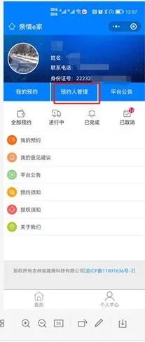 点击个人中心-预约人管理-确认协议-填写预约人信息并保存(最多可以建立五个预约人信息)