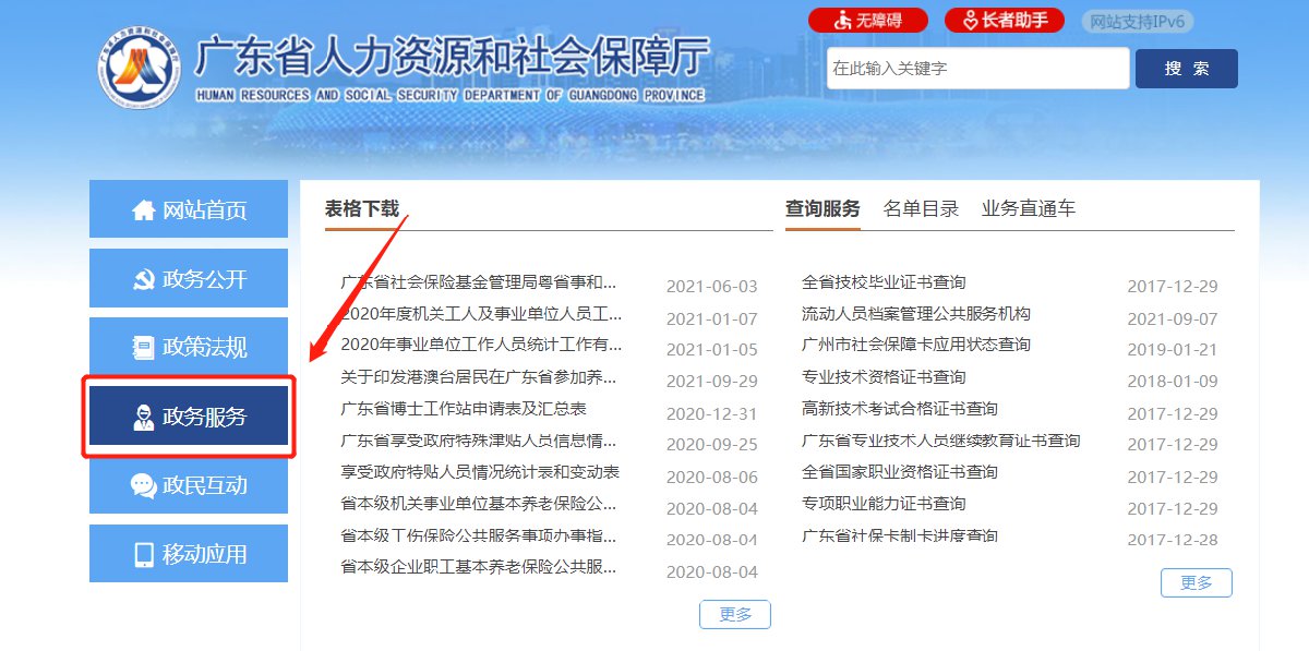 登陆广东省人力资源和社会保障厅网站(hrss. gd. gov.cn),点击下方【广东社保服务】小理相关业务。或点击左侧【政务服务】,进入广东政务网省人社厅网上服务窗口,进入对应的社保服务实施清单事项页面办理业务。