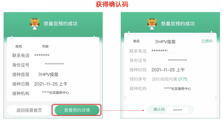 4.预约成功后,将获得确认码和确认短信。请携带本人有效身份证和预约成功信息,按预约时间准时前往接种点接种。
