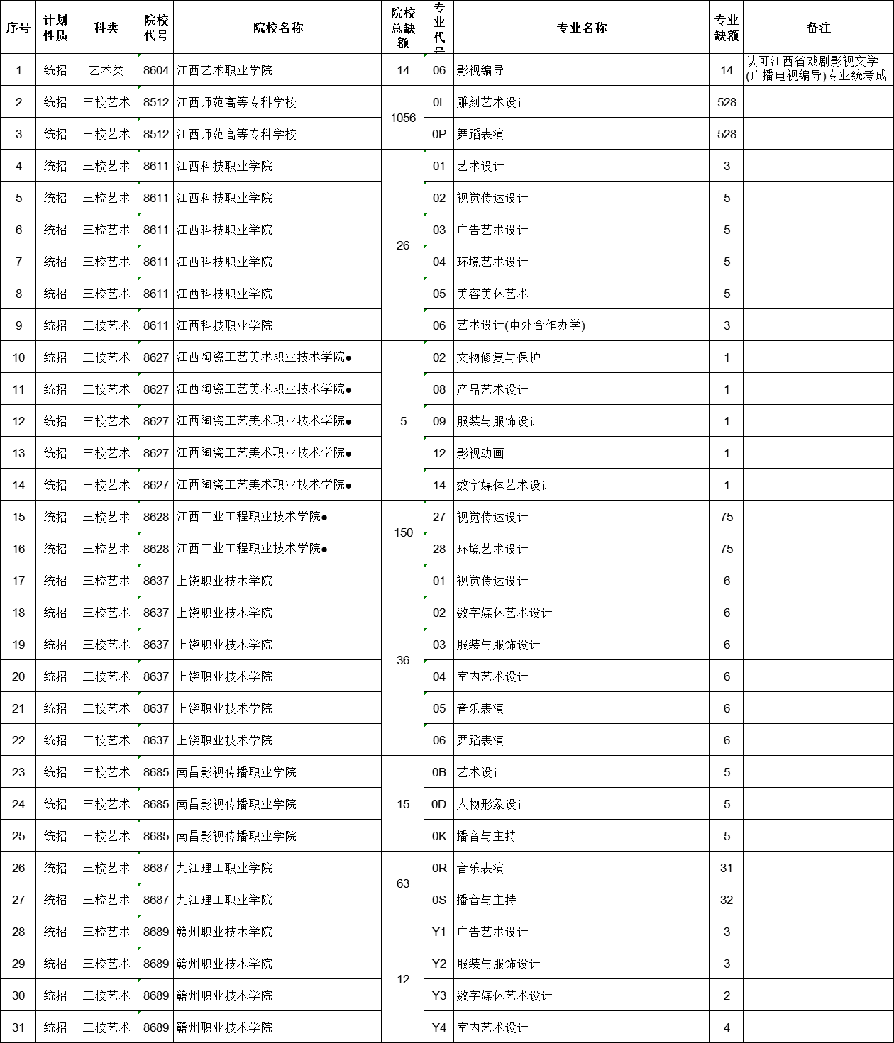 ➤江西省2022年普通高校招生提前批高职(专科)艺术类、三校艺术类缺额院校及专业统计表: