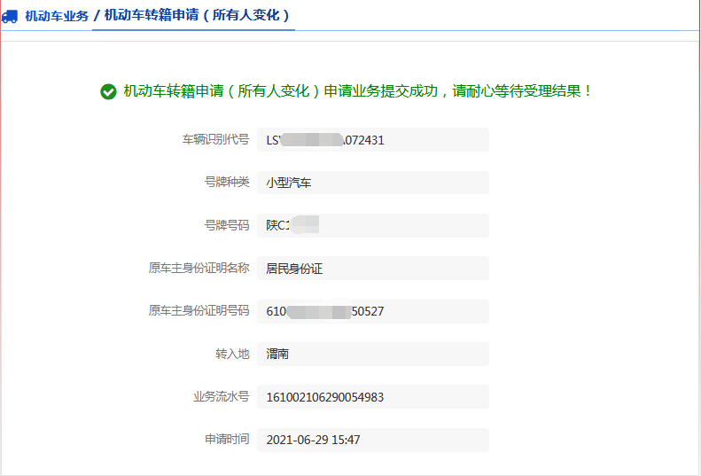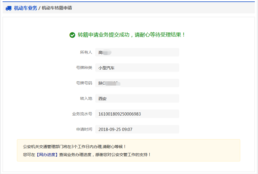该步骤提交成功后,系统生成业务流水号。该步骤提交成功后,系统将于提交后的三个工作日(不含当天)受理,届时会发送短信告知受理结果。用户可以根据该业务流水号在网办进度中查询业务办理进度。