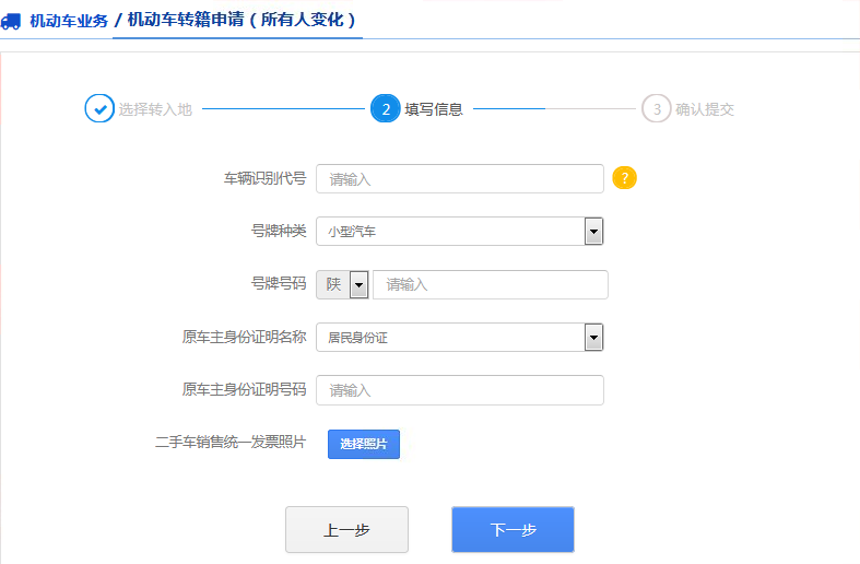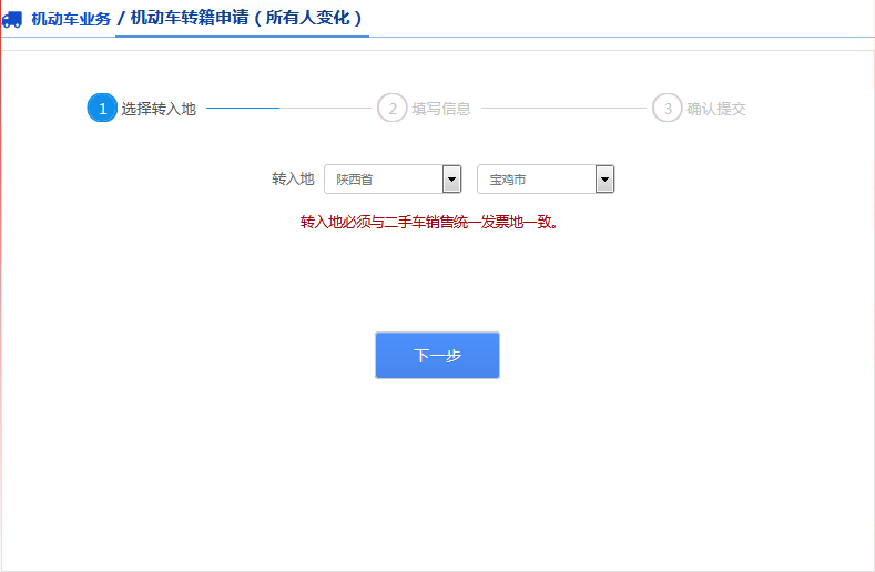 用户选择机动车转入地,选择完成后漫游至转入地办理业务,点击【下一步】,进入步骤2【填写信息】。