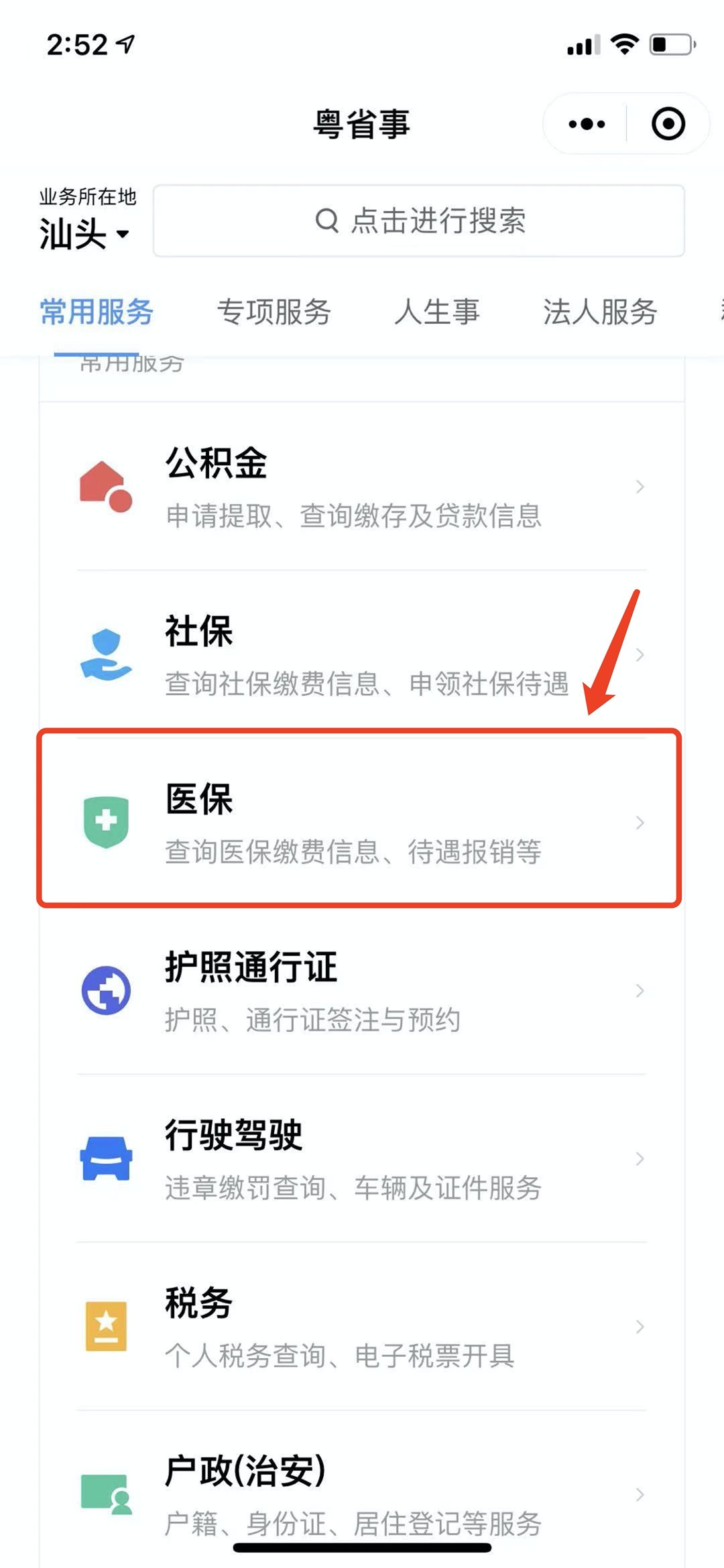 第三步:在“粤省事”微信小程序首页点击“社保”服务,在“社保”版块找到“医疗保险”。