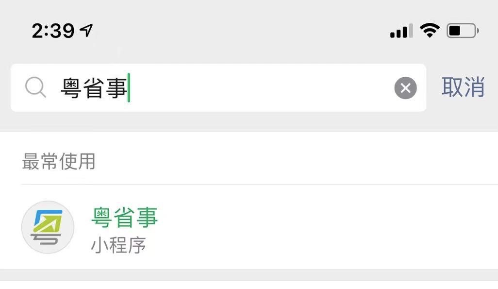 第一步:微信搜索“粤省事”小程序,点击进入。