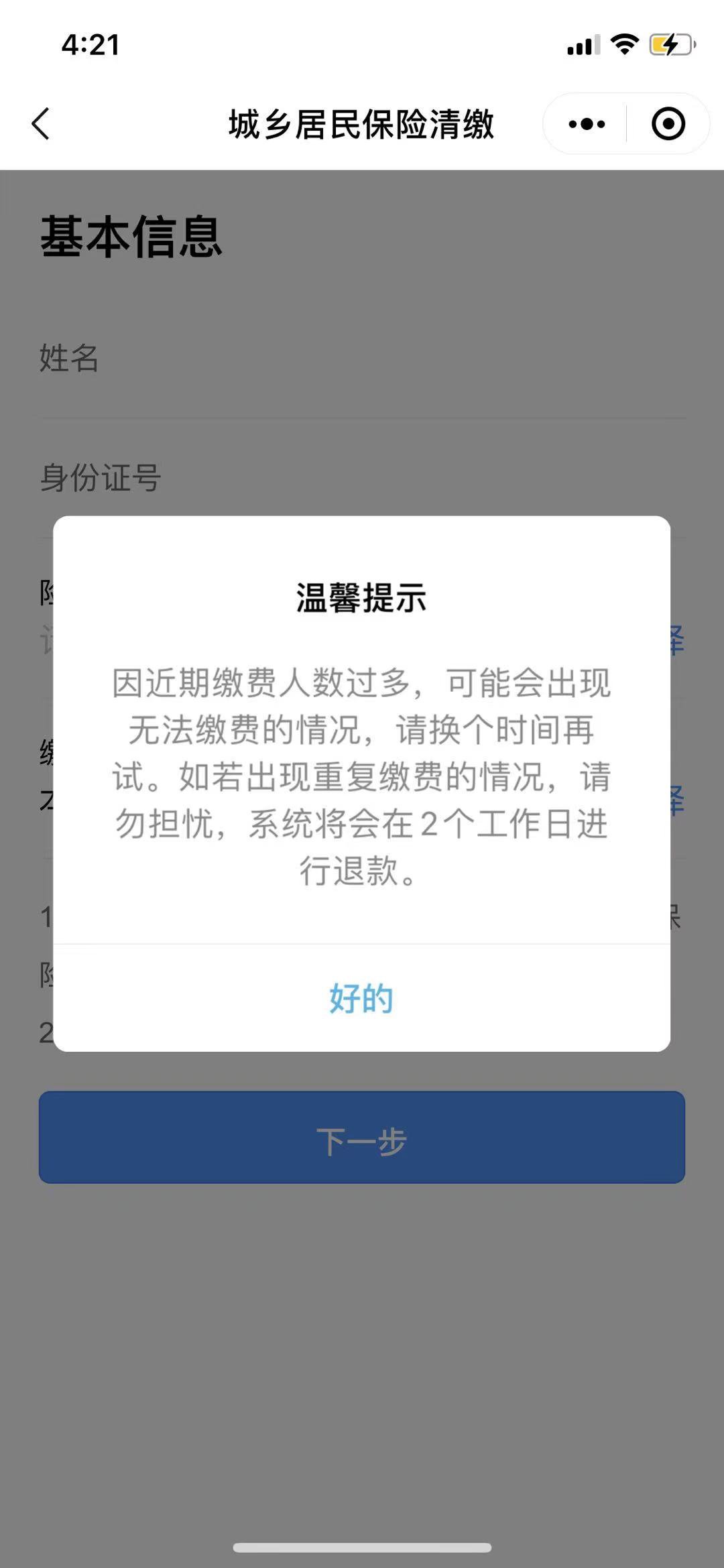 例如“粤省事”小程序,线上医保缴费的提示。一般情况下医保缴费都会持续几个月,建议大家不用太着急过两天再试试,不过一定不要忘了缴费哦!