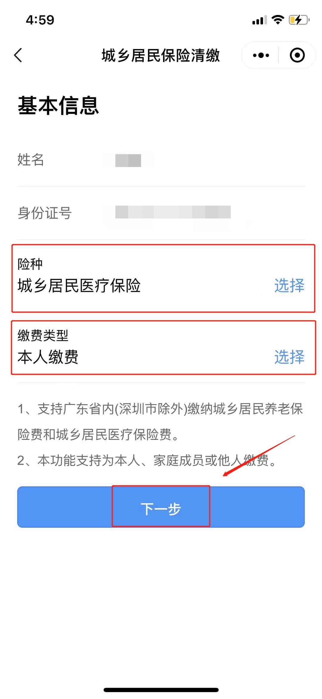 第五步:按要求选择险种和缴费类型,点击【下一步】,按照指引操作即可缴费。