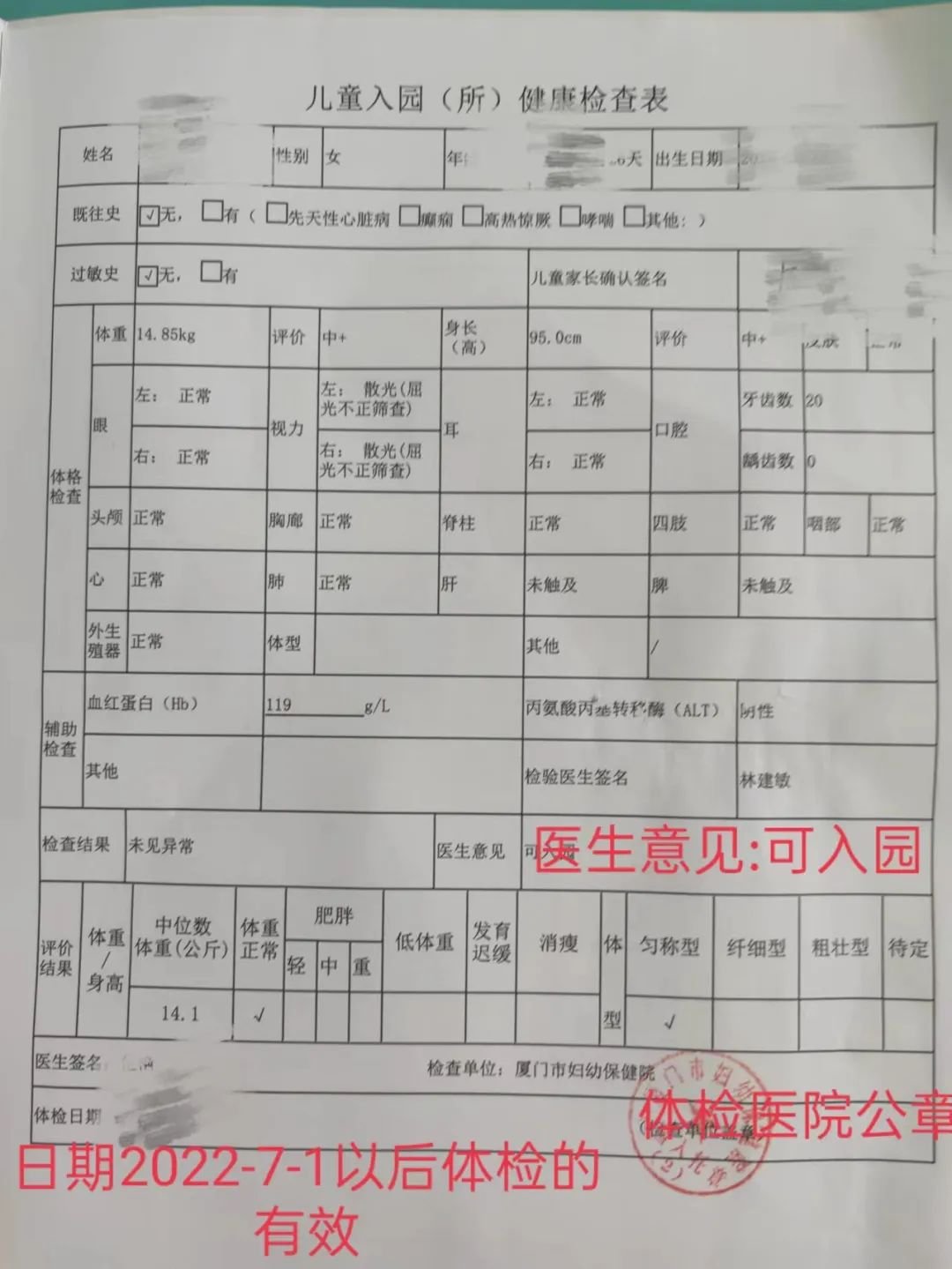 厦门市妇幼保健院或各区妇幼保健院入园体检表加盖公章,体检时间为:2022年7月1日起有效。注:中大班插班生需重新体检~