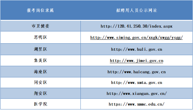根据岗位要求以及考试、体检、考察结果,确定拟聘用人员名单,市属和各区属卫生事业单位拟聘人选分别在招考系统、各区政府或厦门医学院网站上公示7个工作日。公示网站如下: