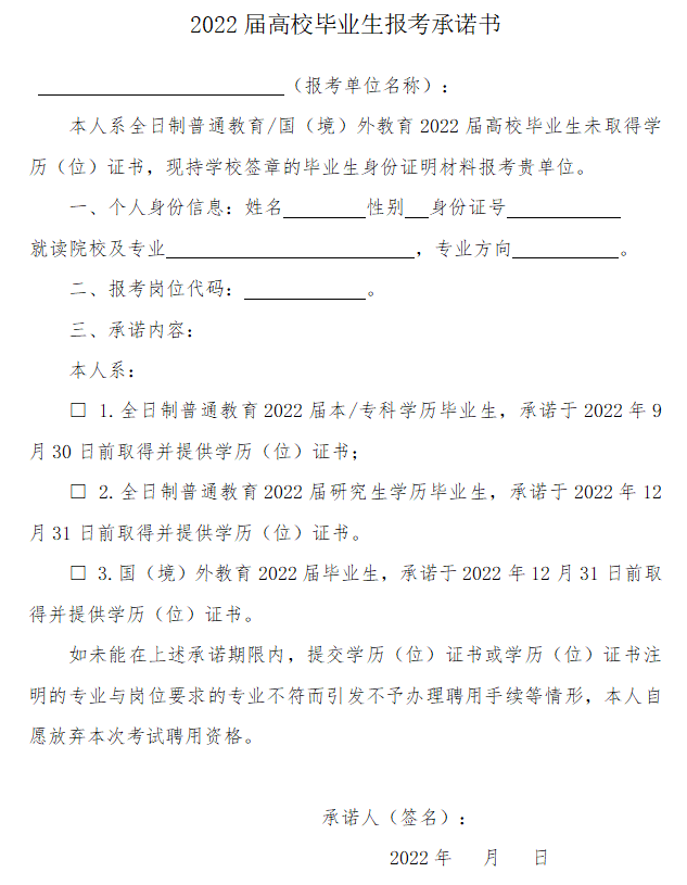 2.全日制普通教育2022届毕业生和持国(境)外学历(位)报考者尚未取得相应学历(位)的,可持学校出具的《就业推荐表》或书面证明报名,在资格复核时提交承诺书(附件),本科及以下学历毕业生须于2022年9月30日前、研究生学历毕业生须于2022年12月31日前取得并能提供符合岗位报考资格条件的学历(位)证书,否则视为自动放弃考试(聘用)资格。