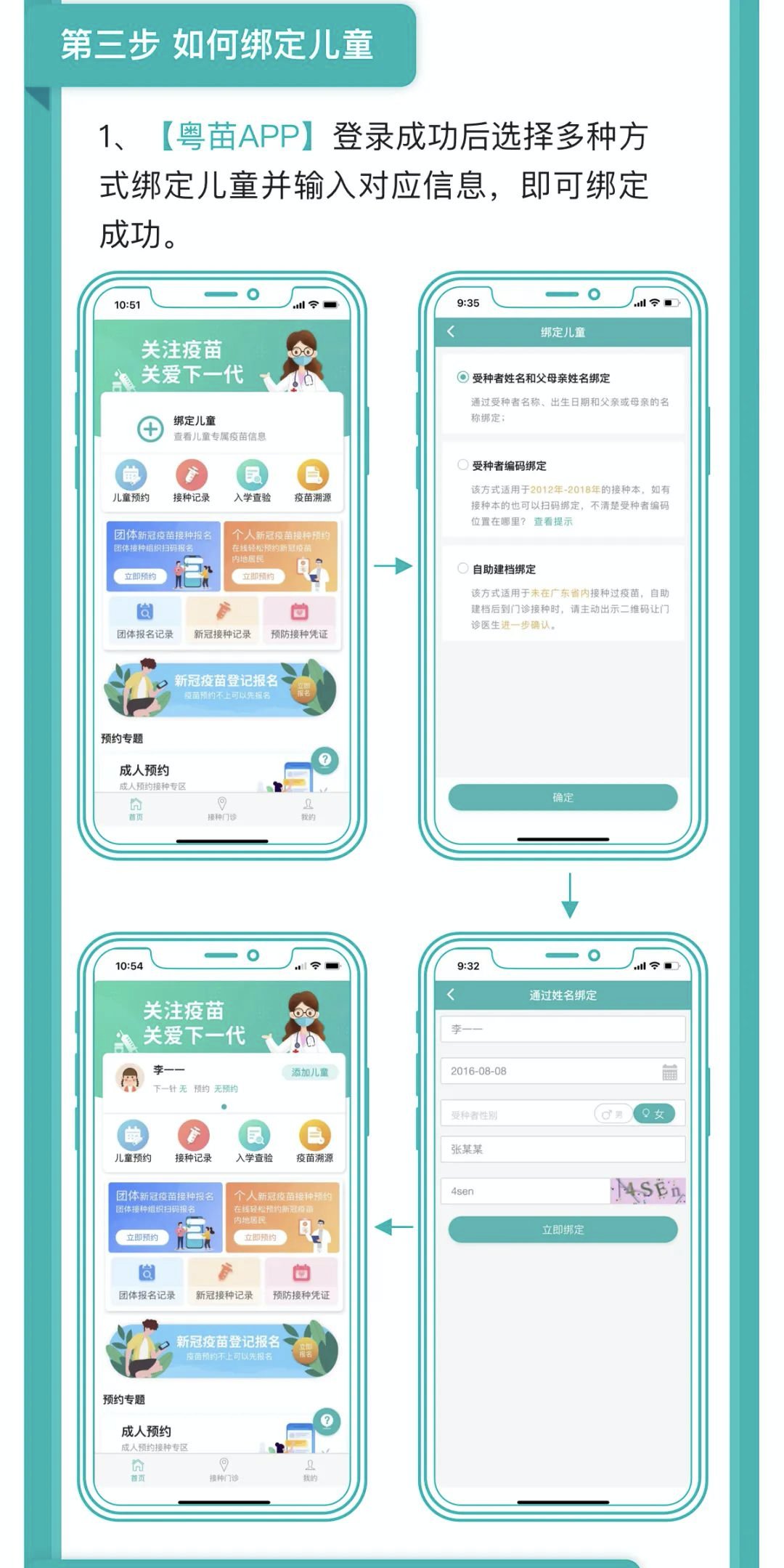 监护人或学生个人通过粤苗APP或粵健通微信小程序绑定省疫苗系统中已有的学生个人档案,自助完善档案中学生身份证号码、父母(监护人)姓名和身份证号码等必需信息,生成接种档案二维码。