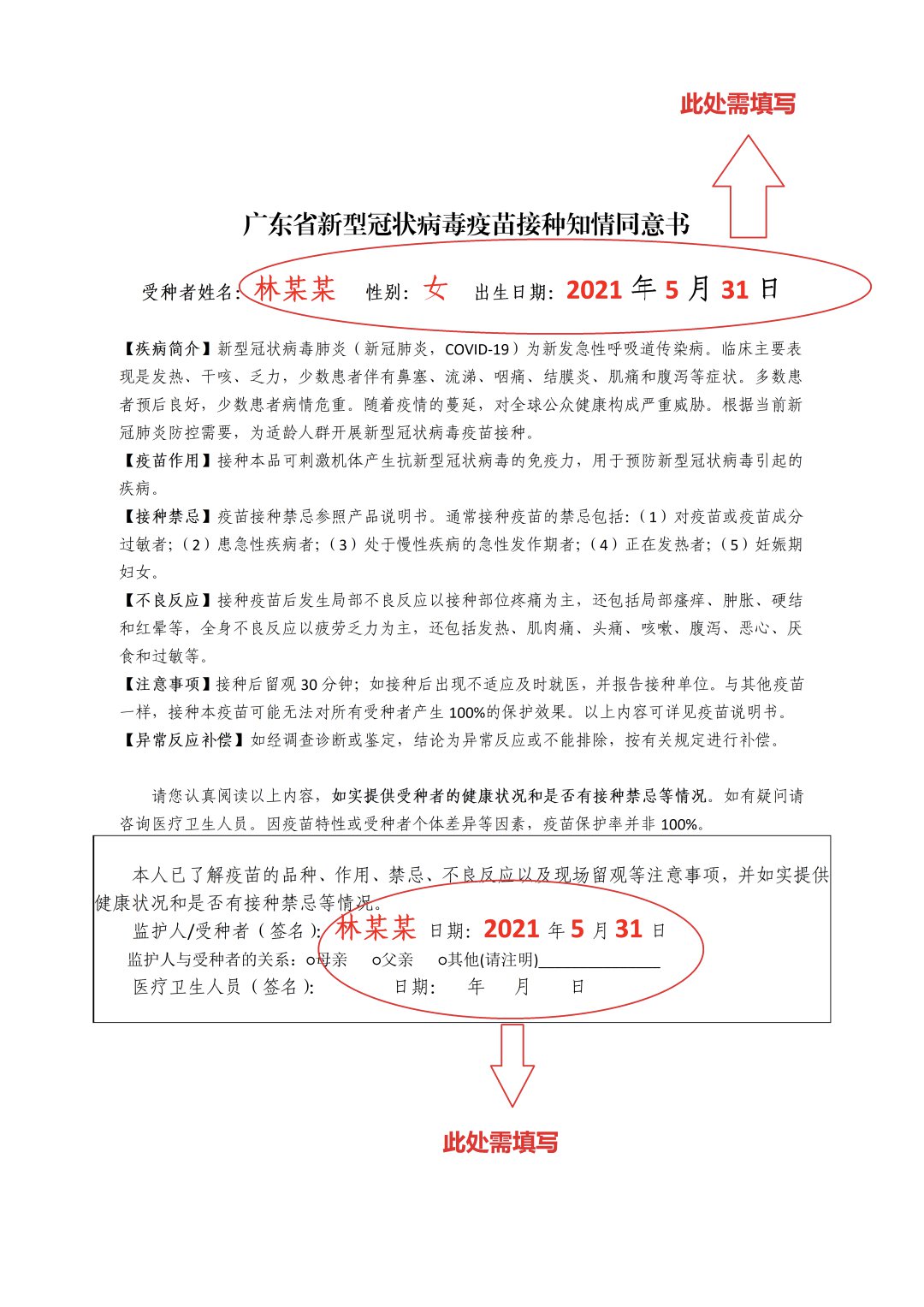 《广东省新冠病毒灭活疫苗紧急使用知情同意书》填写方法: