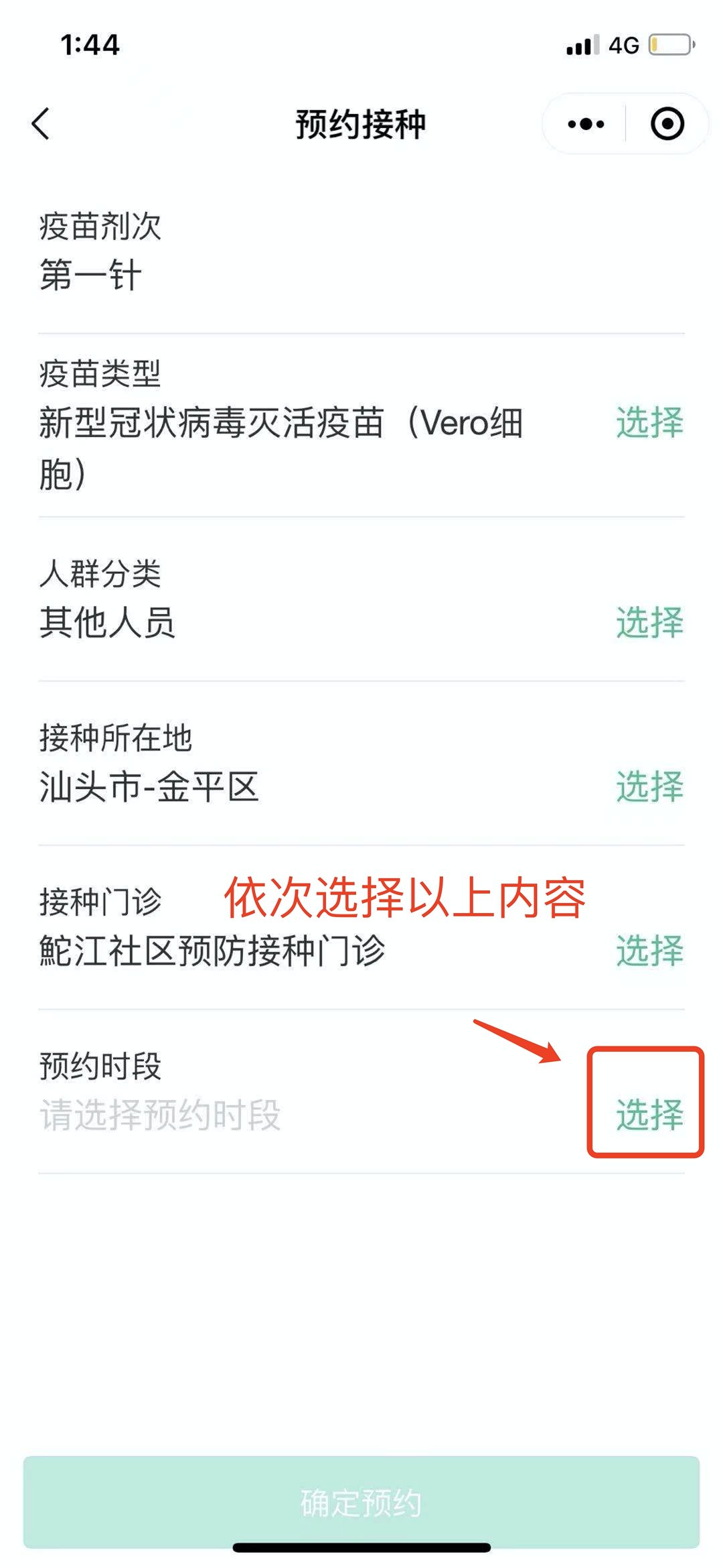 ⑤选好接种所在地和有放号的门诊后,点击预约时段。