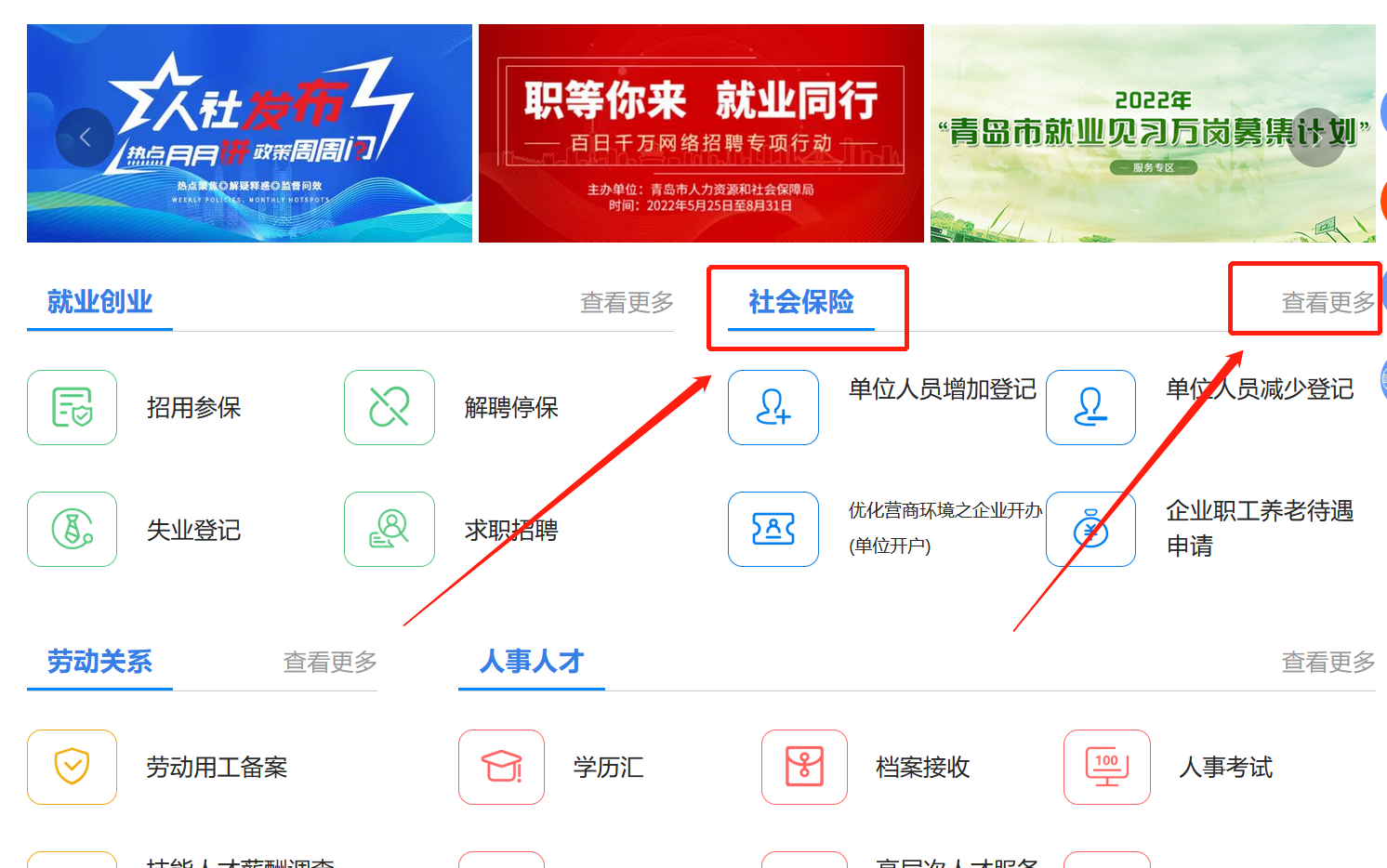 1、登录市人社局官网,点击社会保险板块下,点击“查看更多”。