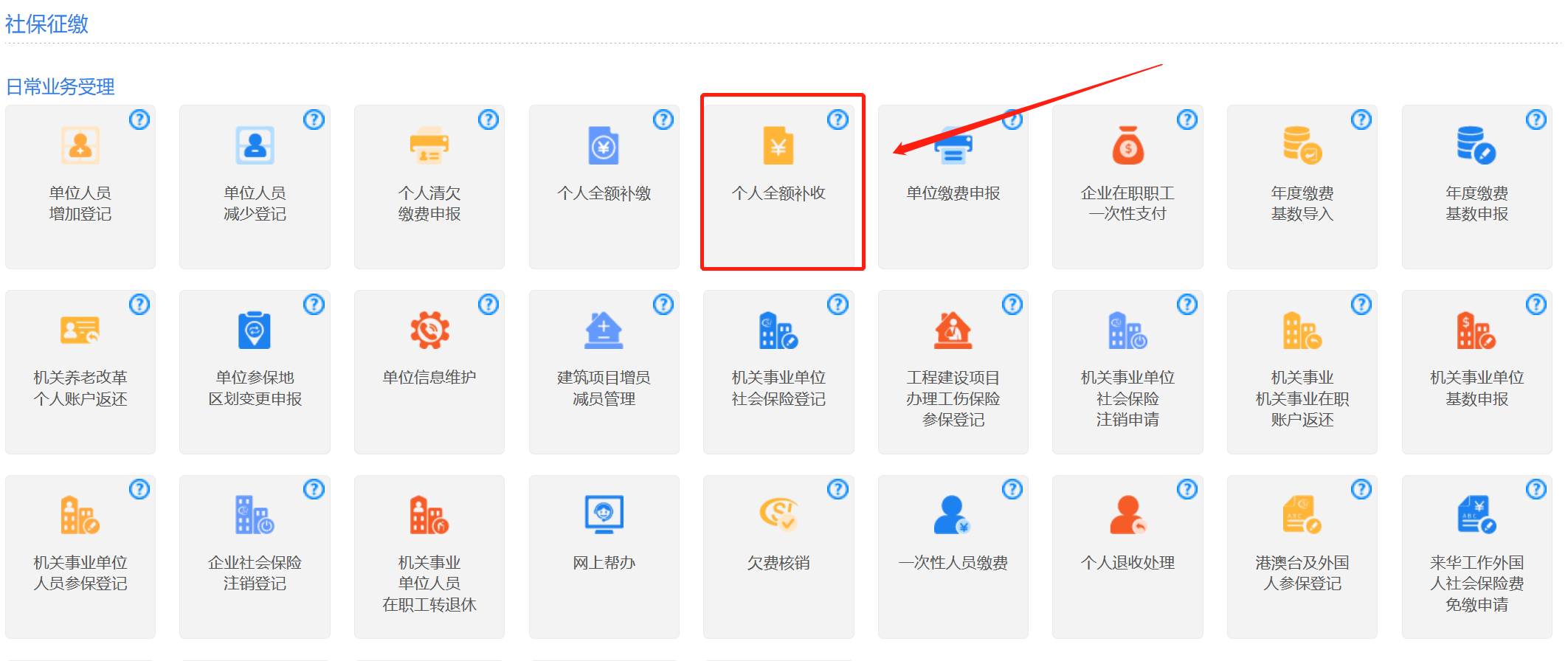 3.点击“个人全额补收”,用人单位账号登录,按提示录入补缴人员信息和补缴时间段,点击“提交”完成补缴业务办理。