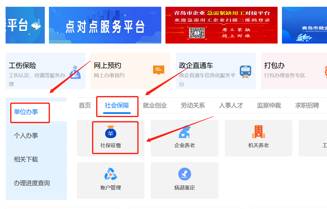 2.选择“单位办事”,点击“社会保障”,点击“社保征缴”。