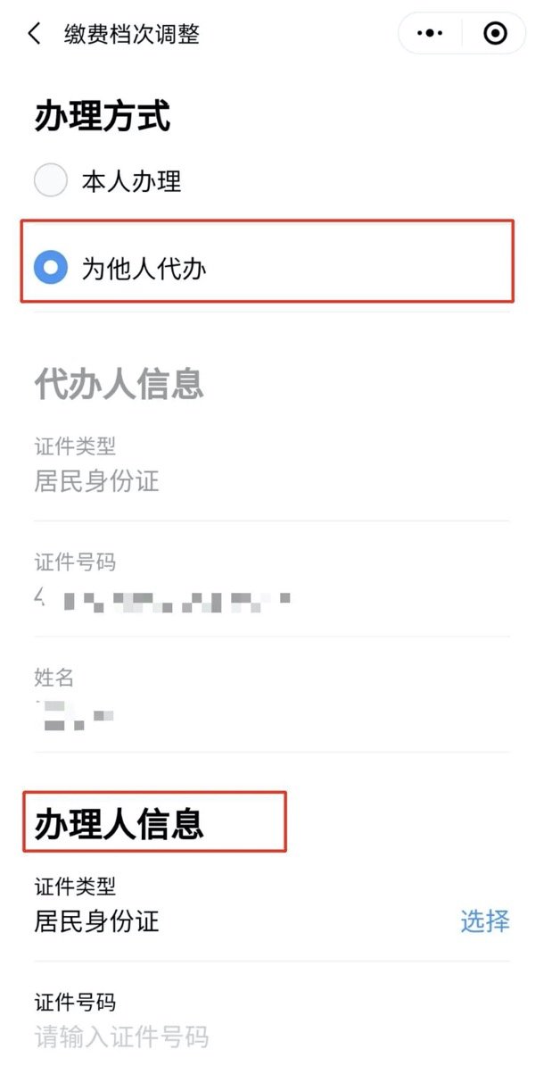 (二)选择“本人办理”或者“为他人代办”,输入参保人的身份证号码、姓名等信息,可查询当前缴费档次。