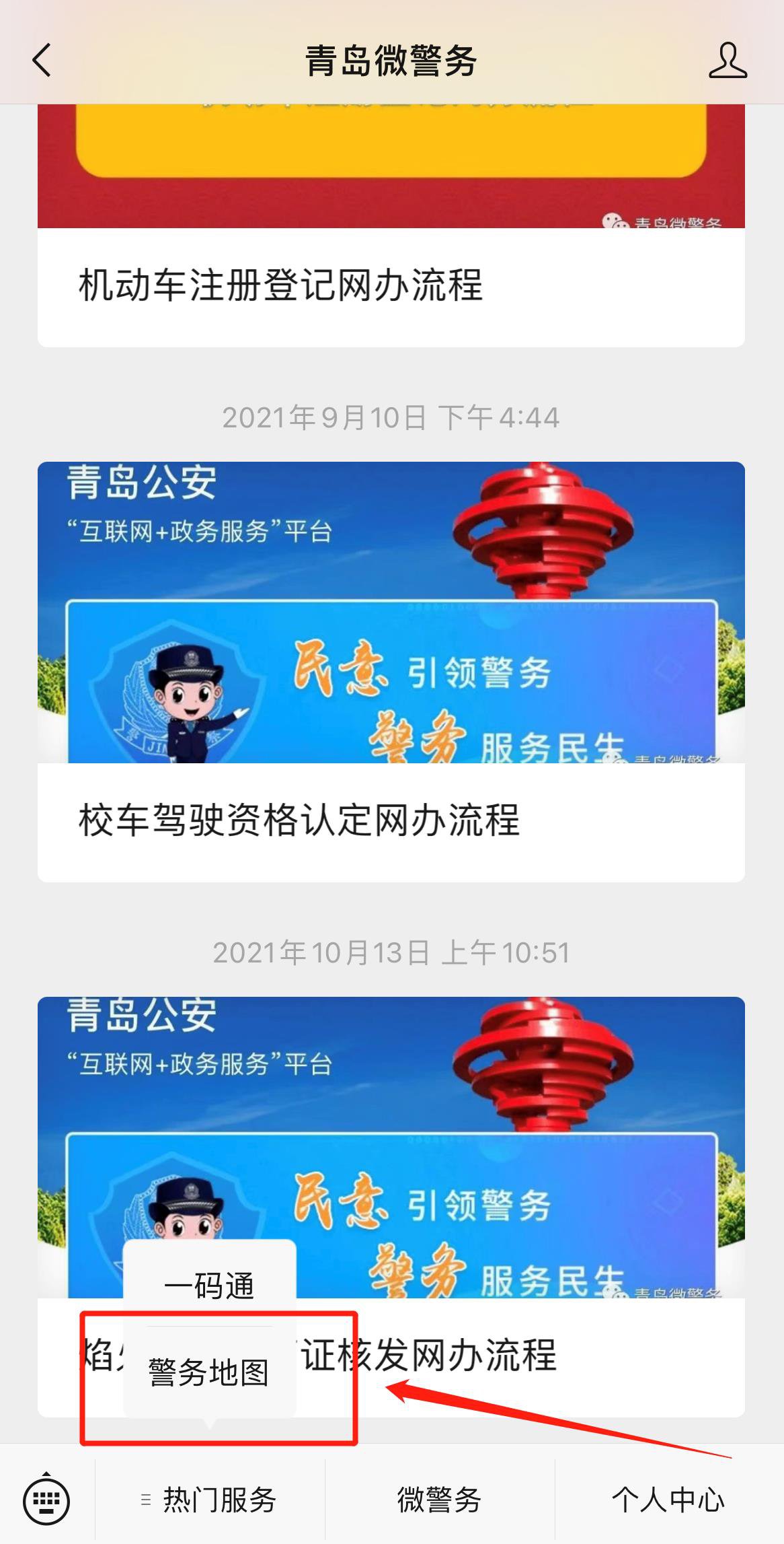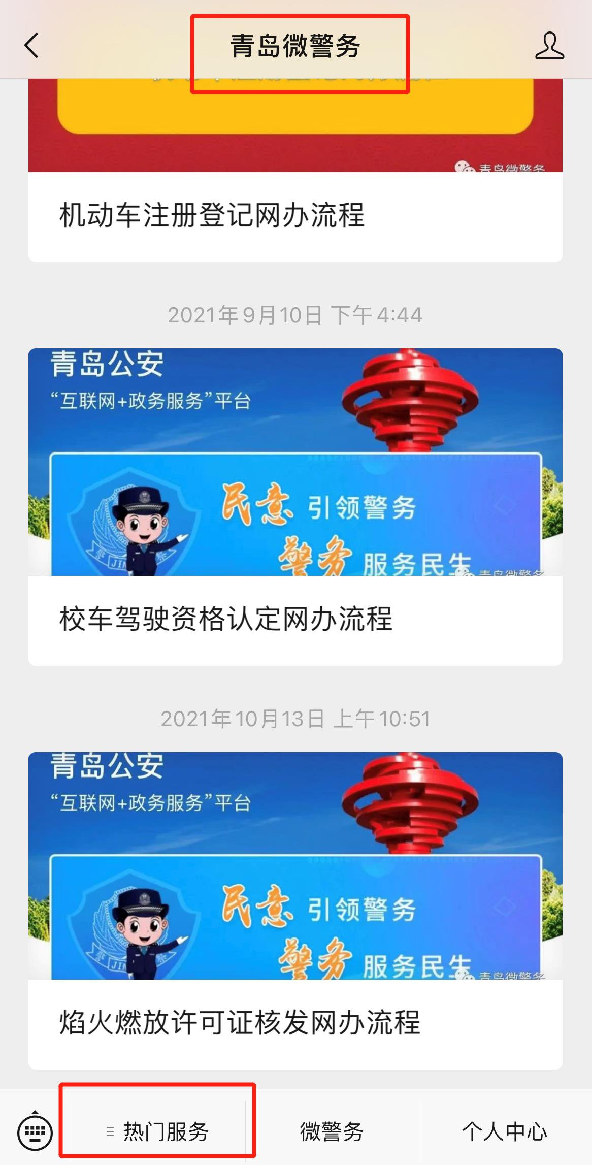 1、进入“青岛微警务”微信公众号,点击左下角“热门服务”。