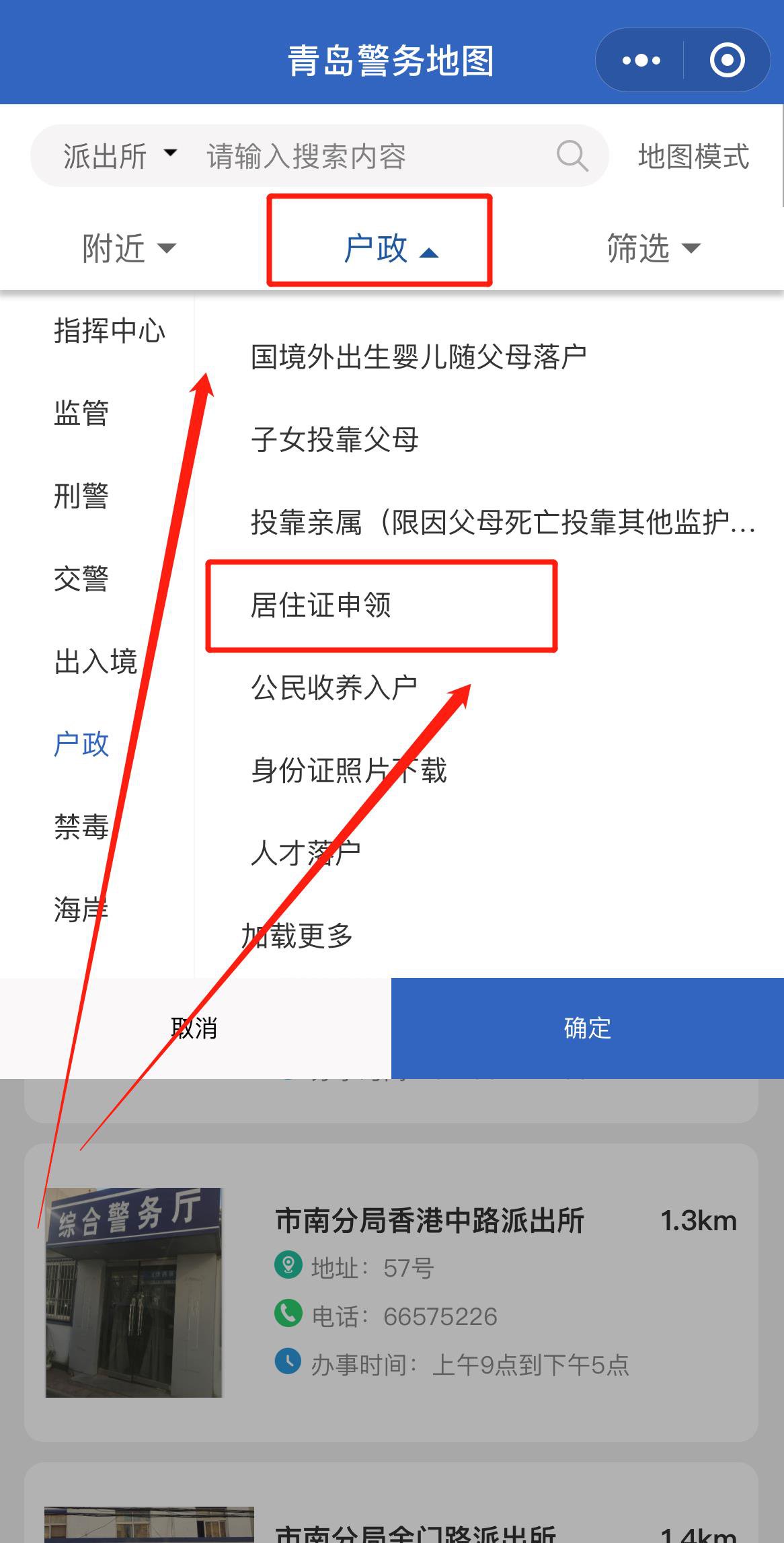 4、找到左边栏“户政”,选择“居住证申领”,即可查询附近可办理的派出所信息。