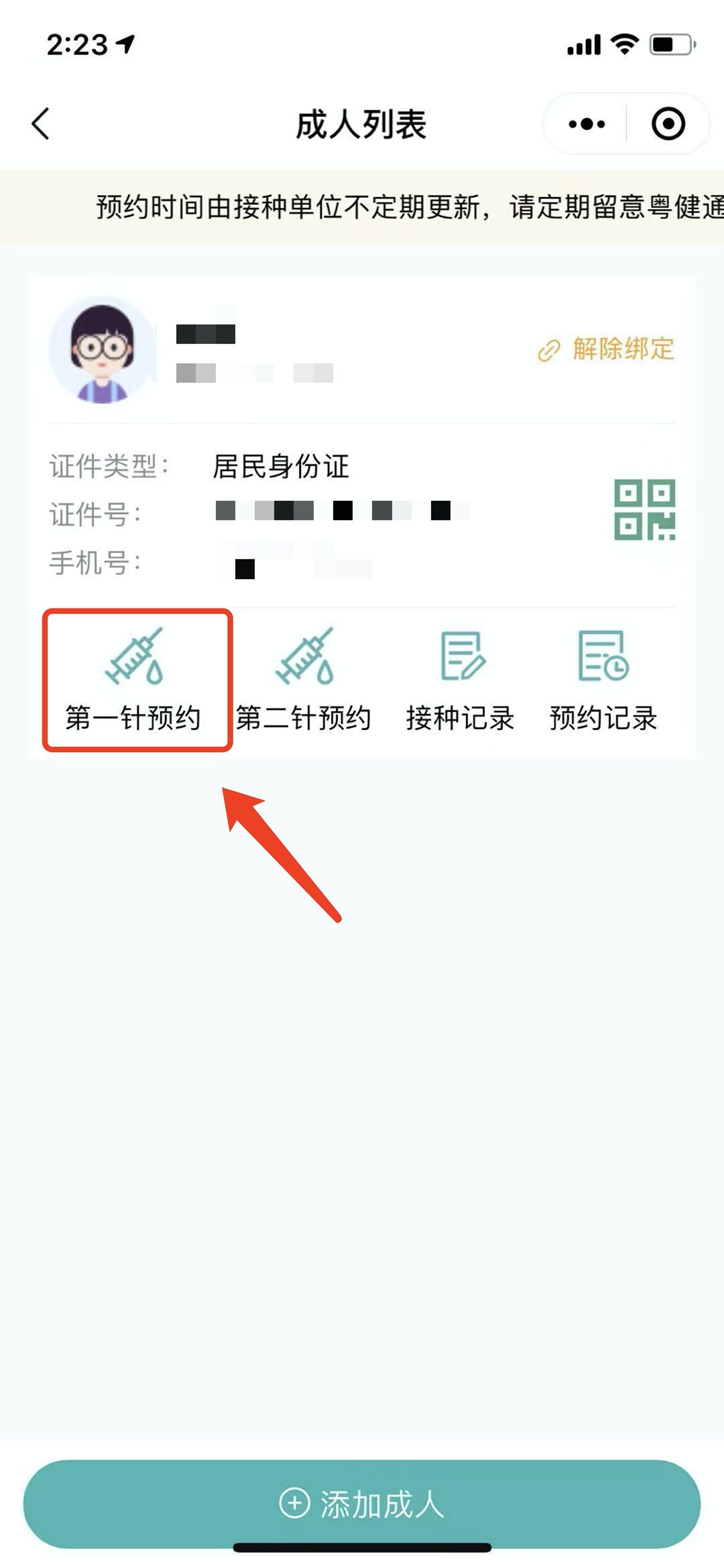 第四步:点击【新冠疫苗个人接种预约】,进入页面后选择【第一针预约】。