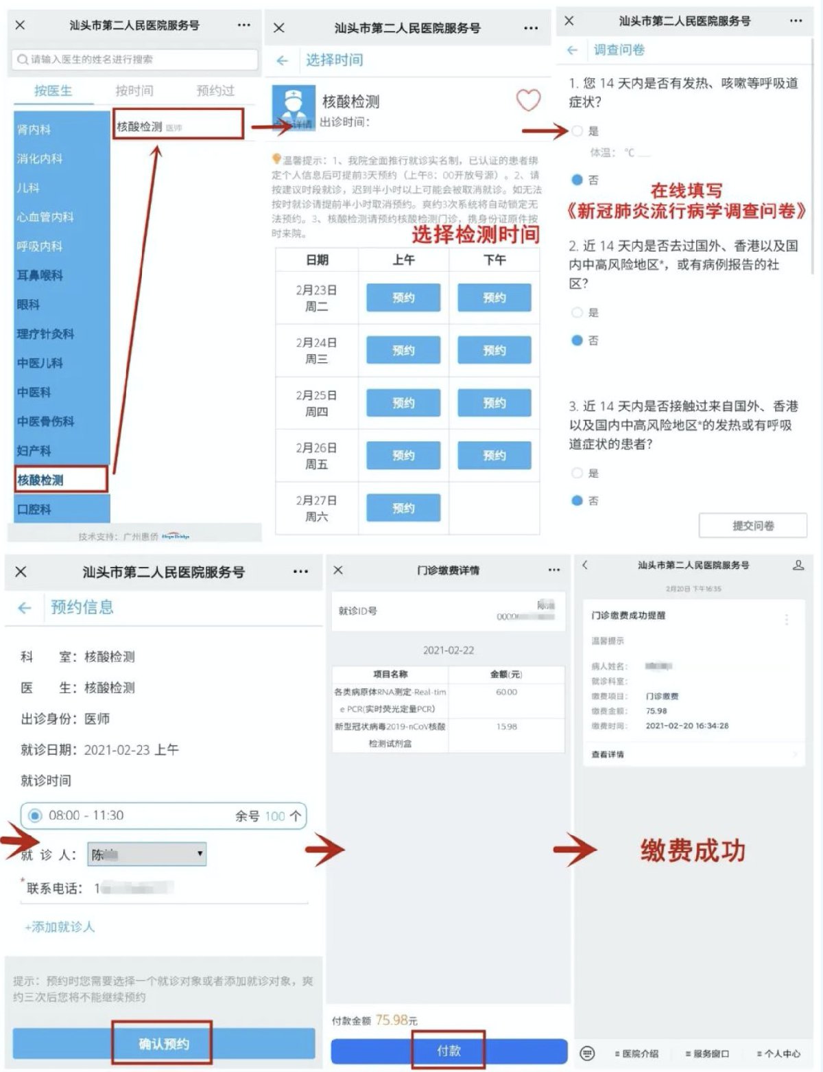 根据您的实际情况预约时间,按照操作指引进行就诊人信息绑定、调查问卷填写、确认预约检测时间段并完成缴费。
