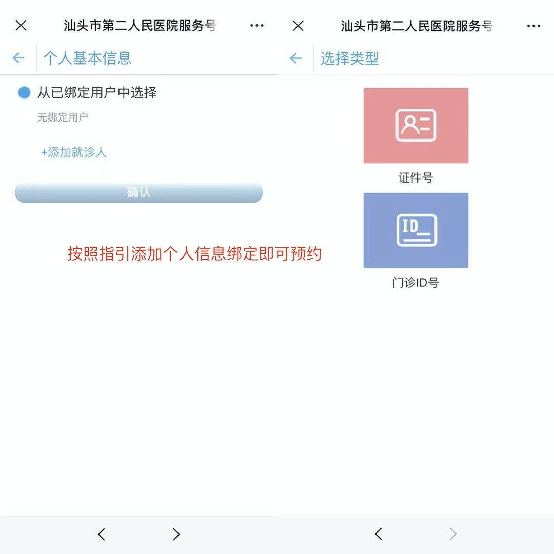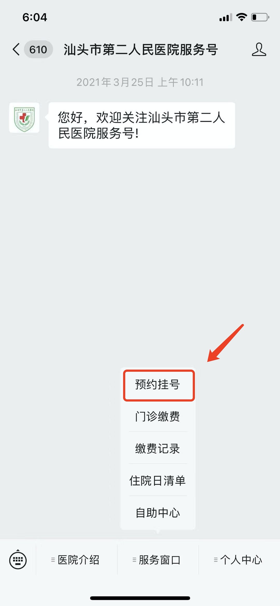 如果无法打开可以打开微信,搜索【汕头市第二人民医院服务号】进入公众号,点击下方【服务窗口】➤【预约挂号】。