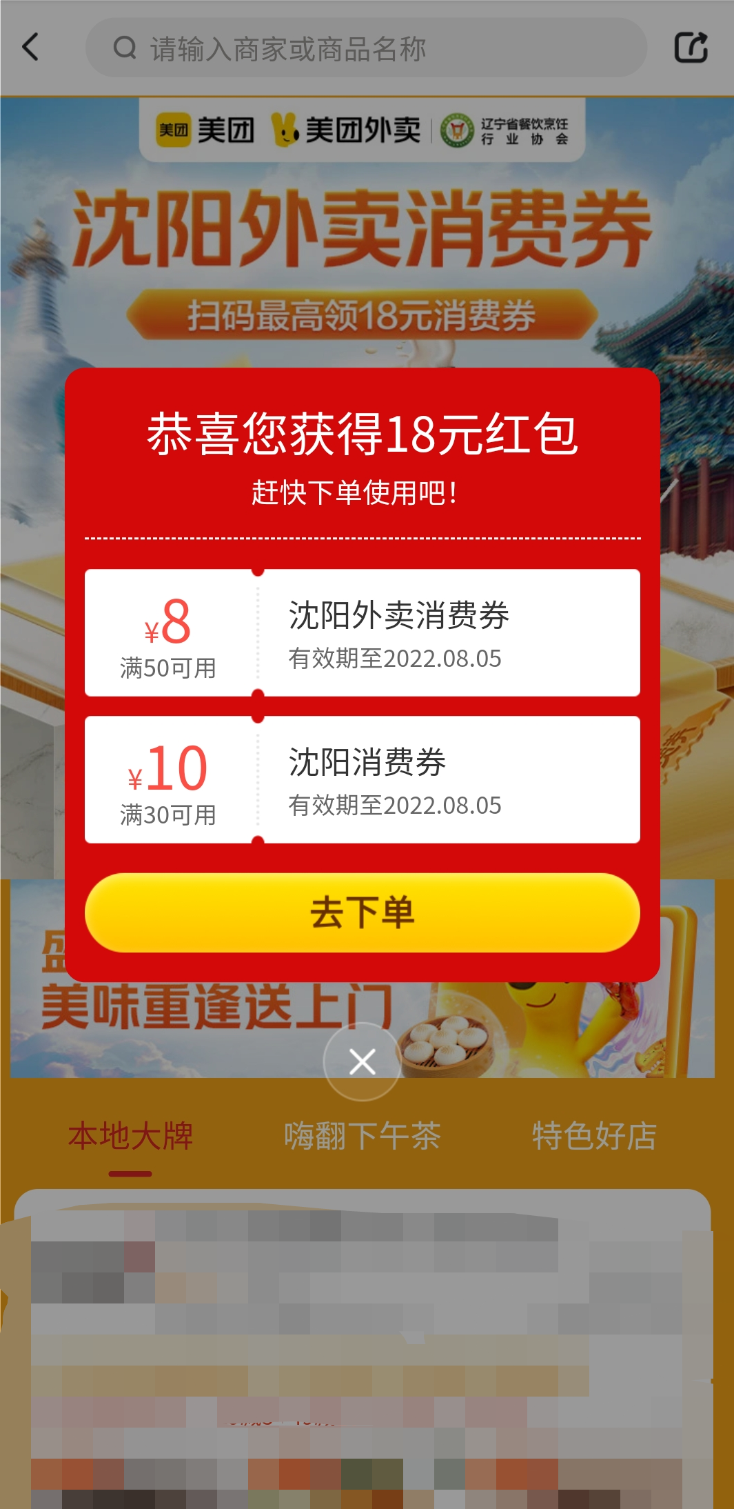 方式2:在美团外卖App搜索关键词“东北美食节”或“沈阳外卖消费券”即可登录活动界面,领取固定金额消费券。