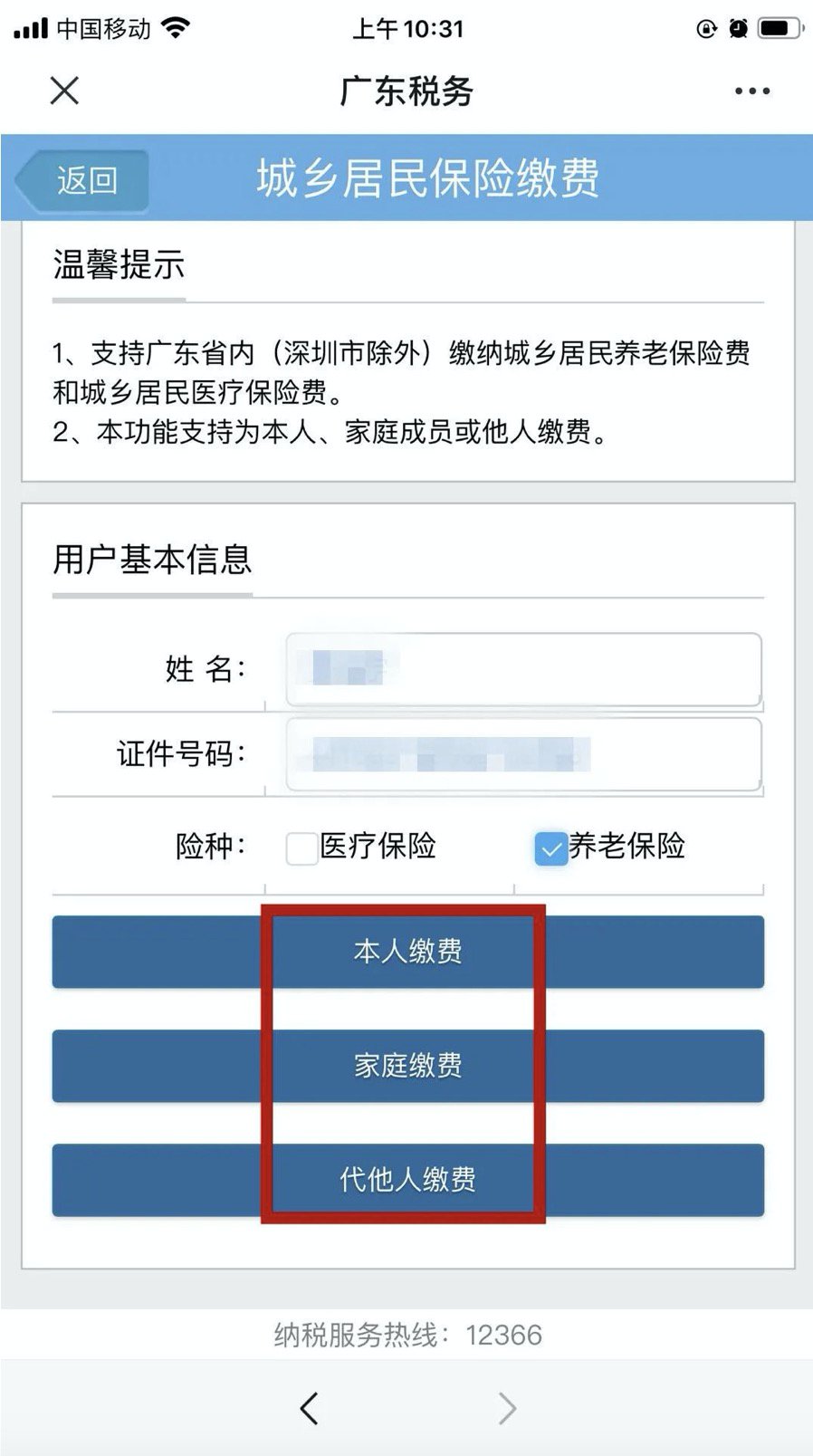 第三步:选择“本人缴费”“家庭缴费”“代他人缴费”。