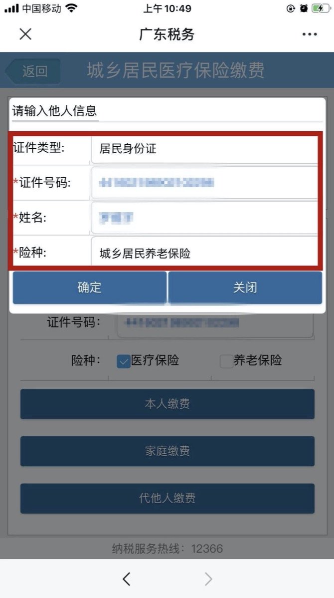 根据情况“缴费类型”可选择点击“本人缴费”、“家庭缴费”(注意:选择“家庭缴费”,操作人必须在该家庭户籍内) 、“他人缴费”、 “代其他家庭缴费”,选择缴费对象,输入户籍信息,点击“缴费”,选择缴费方式,完成缴费。