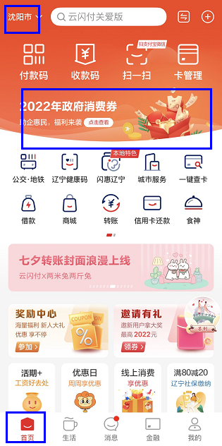 1、下载安装“云闪付App”,并注册登录,点击底部菜单栏“首页”,定位选择“沈阳市”,然后点击最上端“2022年政府消费券”;