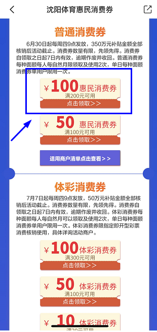 3、下滑选择相应消费券并点击“点击领取”→“立即领取”即可领取成功。(说明:活动时间内即可领取)