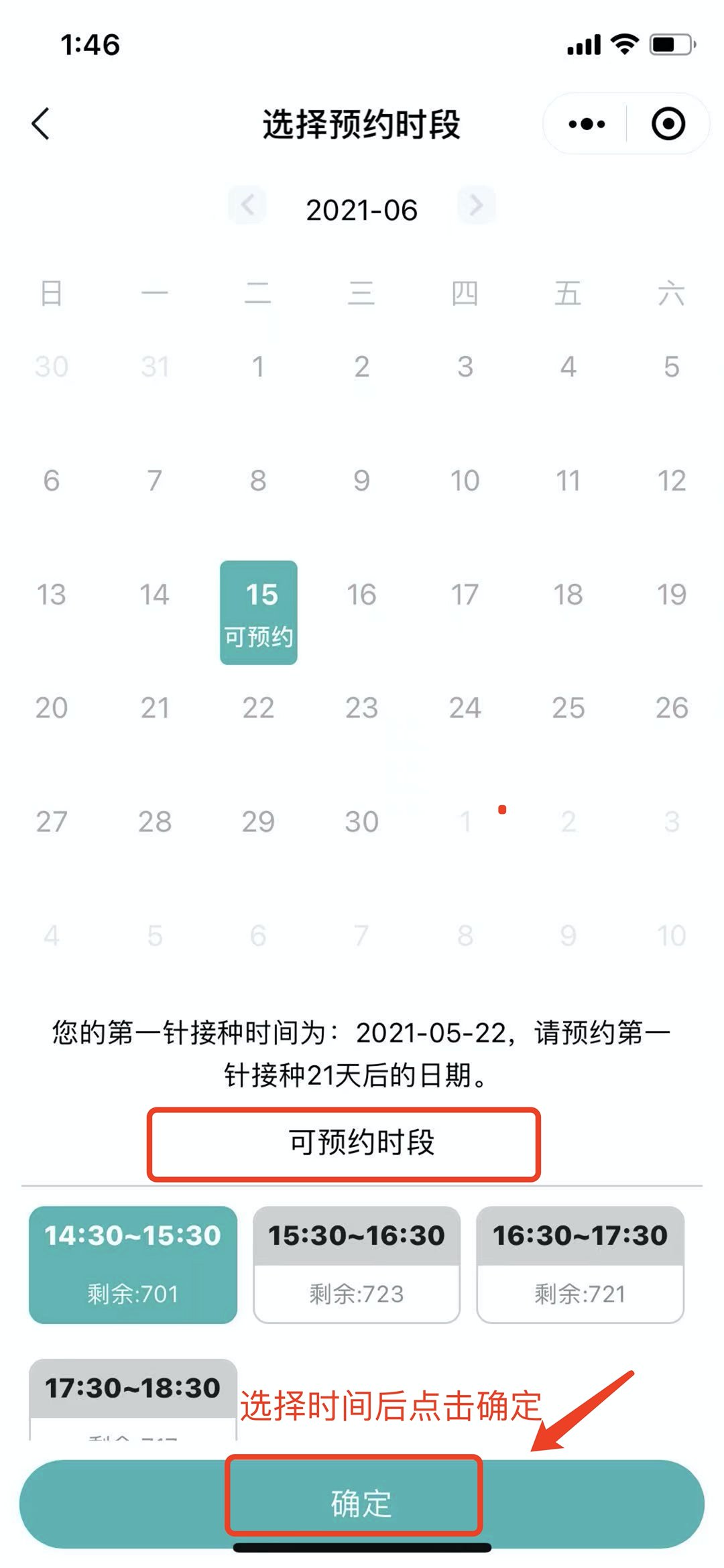 第六步:选择接种门诊和预约时间后点击【确定】即可预约成功。
