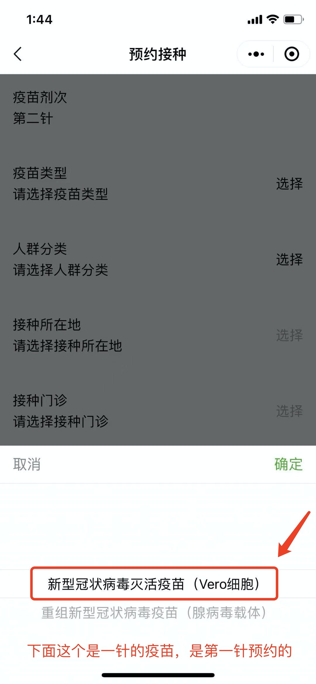 第五步:和预约第一针一样,依次选择页面上的五项内容,这里要注意疫苗类型选择【新型冠状病毒灭活疫苗(Vero细胞)】此前汕头接种的都是北京生物和北京科兴,这里选择灭活疫苗即可。