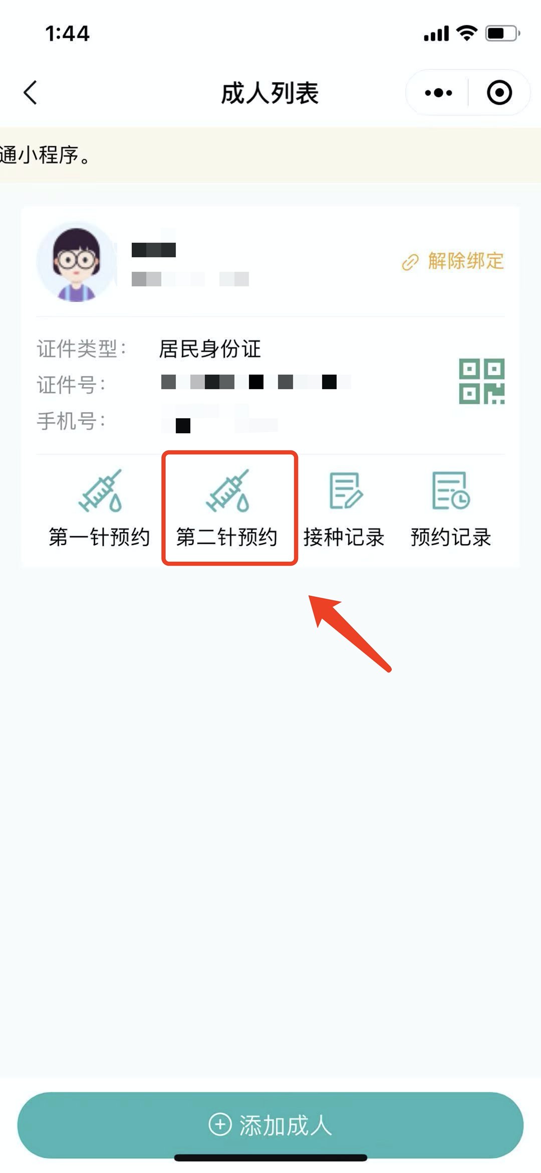 第四步:点击【新冠疫苗个人接种预约】,进入页面后选择【第二针预约】。