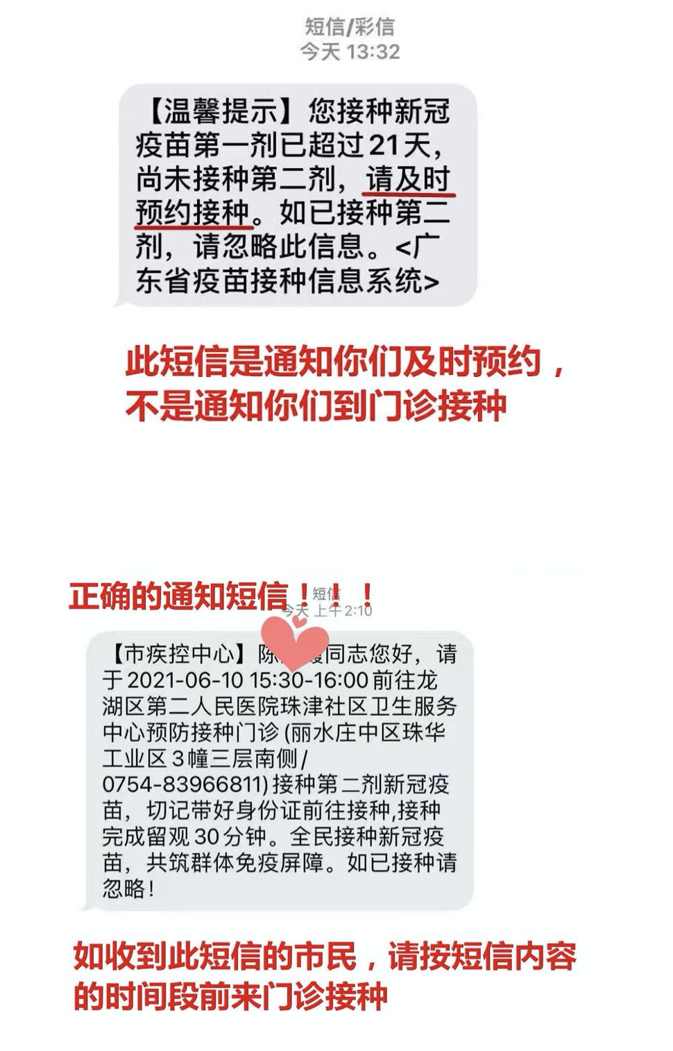 这两天不少已经接种新冠疫苗第一针超过21天的市民接到第二剂次的疫苗接种提醒。是由广东省系统平台发出的温馨提示,此短信是通知你们及时预约,不是通知你们前来门诊接种,门诊会根据疫苗到货数量安排发短信,请大家耐心等待通知,具体接种时间按照通知时间为准。