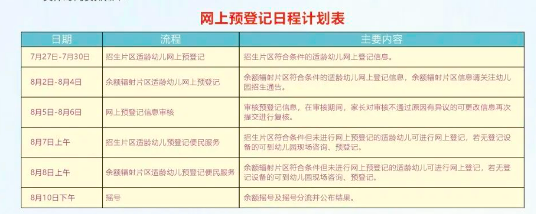 4.预登记便民服务时间,招生片区:2022年8月7日上午8:00—11:30;余额辐射片区:2022年8月8日上午8:00—11:30。